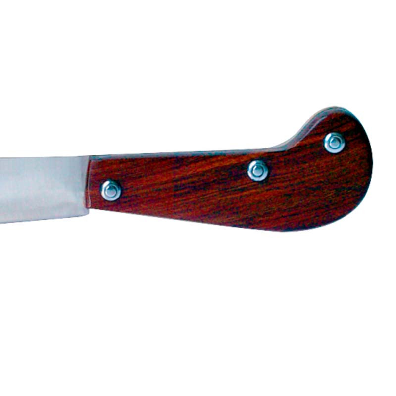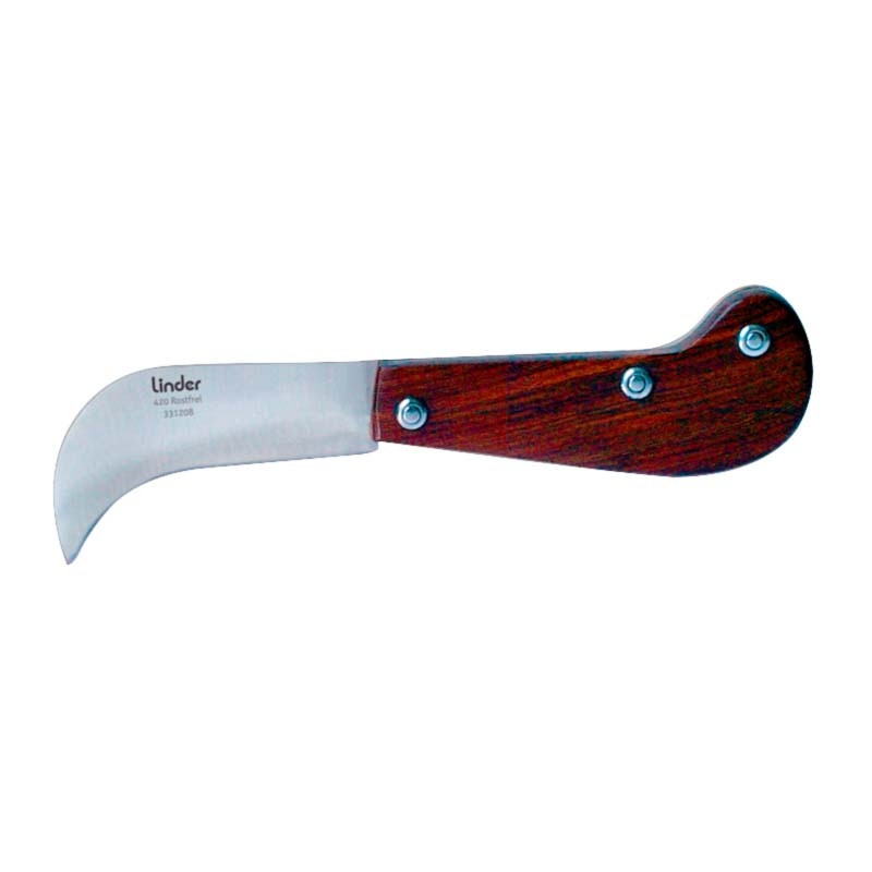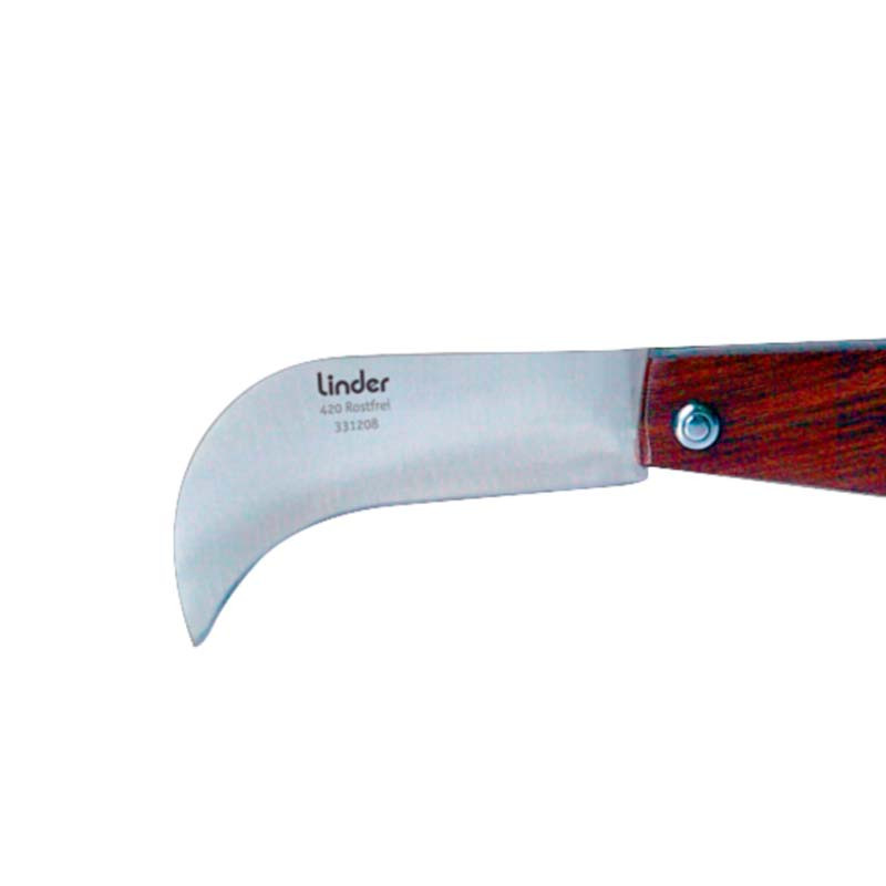 Cuchillo de jardinero con cuencos de madera de color marrón medio. La empuñadura angular evita el chasquido involuntario de la cuchilla. Acero inoxidable 420, longitud cerrada de la puntada 8 cm y peso de 86 g.