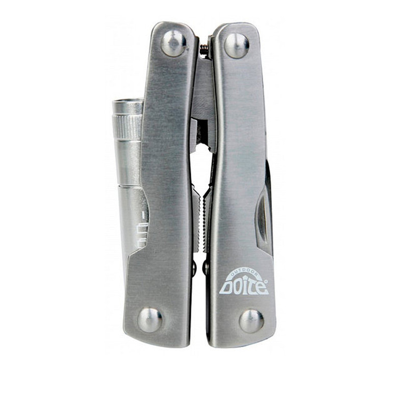 Multiherramienta con linterna LED infaltable en camping. Al ser liviana y compacta, es fácil de transportar. Incorpora un alicate más grande y fuerte. Tiene un diseño especial para poder trabajar cómodamente en lugares estrechos.