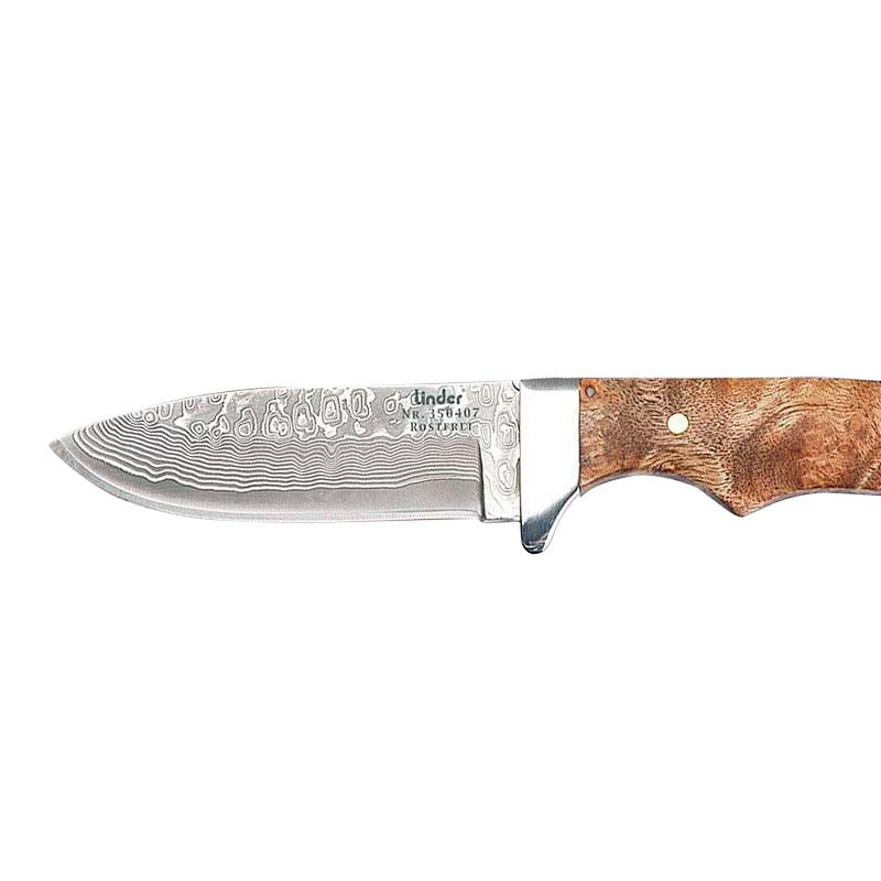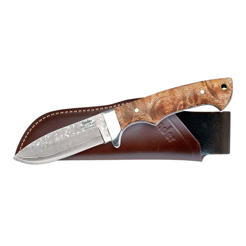 Cuchillo de caza con hoja de acero damasco particularmente atractivo, con hoja de acero inoxidable de damasco, tapas fabricadas en madera noble de raíz de nogal. En una funda de cuero robusta.
