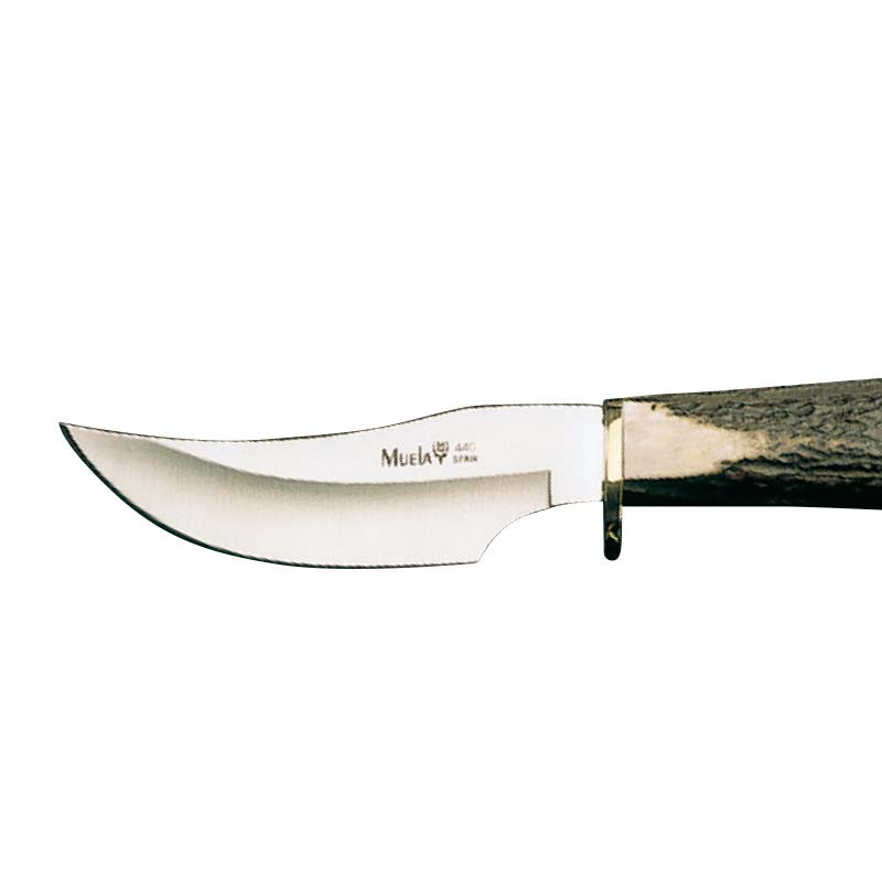 El cuchillo Muela DP-10A posee hoja de acero-cromo-molibdeno-vanadio, empuñadura de cuerno de venado, vaina rígida de cuero con pasador para el cinturón.