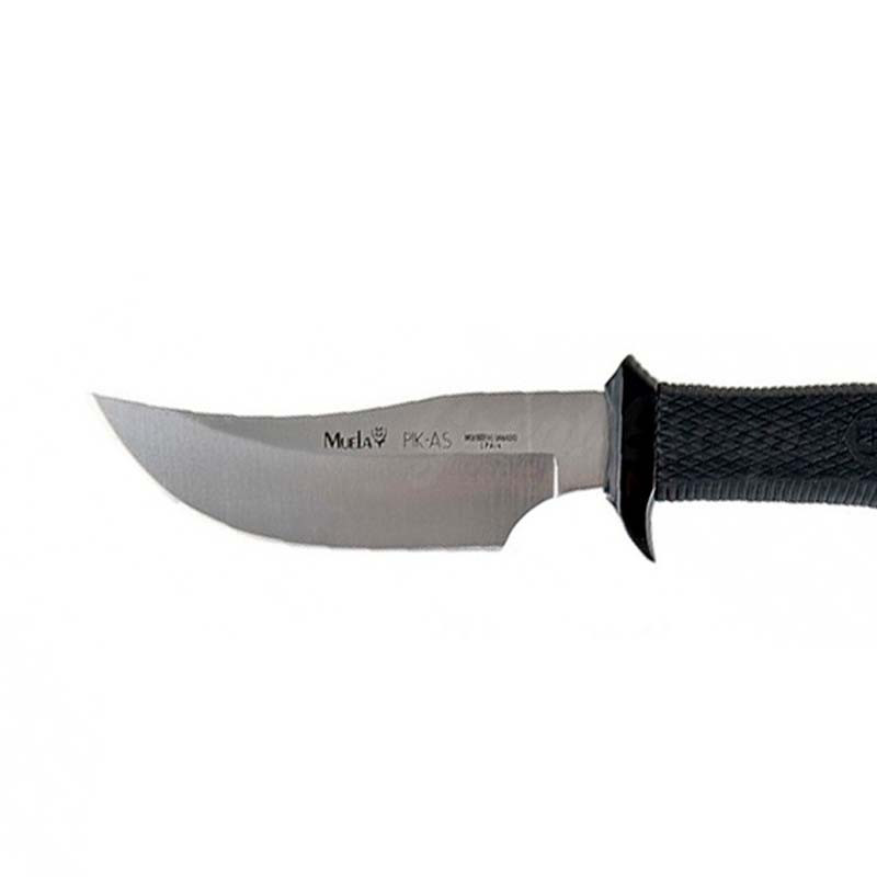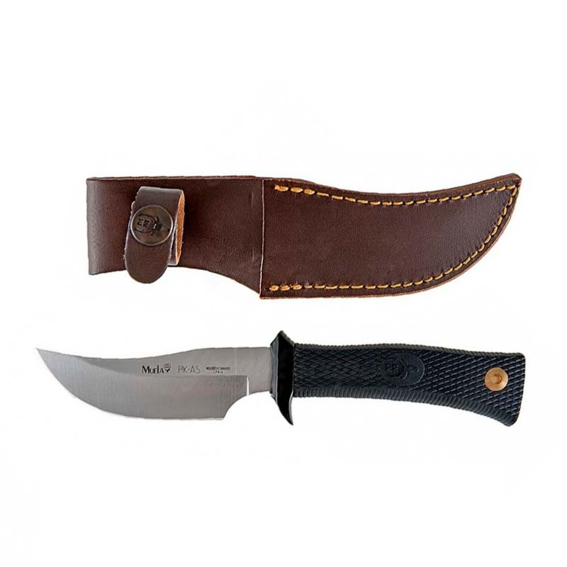 El cuchillo Muela PIK-AS, posee hoja curva de acero molibdeno-vanadio, empuñadura sintética rígida negra vaina de imitación cuero con pasador para el cinturón.