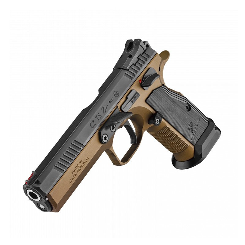La pistola Cz TS 2 tiene un cuerpo con el acabado de superficie Bronce Cerakote y cañón pulido. Las tapas planas de duraluminio y fondos del cargador son anodizados en color negro. La pistola se entrega de manera estándar con un perno que sustituye el retén de la corredera y está provista con un alza de metal regulable, apoyo ajustable para el dedo pulgar de la mano izquierda (thumbrest), apoyadedos regulable anodizado en color negro del retén ajustable de cargador y apoyadedos izquierdo sobredimensionado del seguro manual (el apoyadedos derecho es plano).