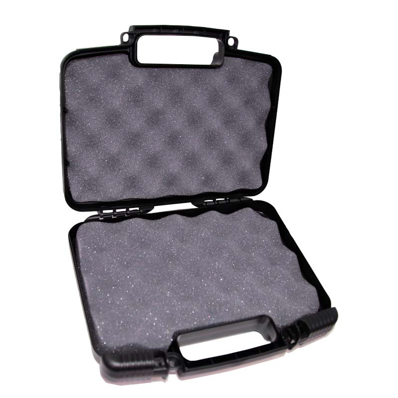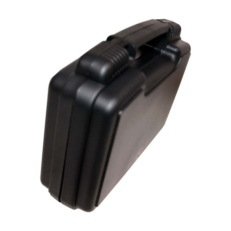 Maleta fabricada en polímero rígido color negro, interior acolchado con esponja y cierre deslizable.