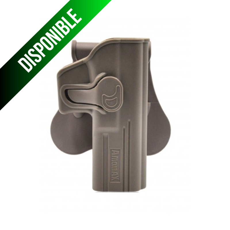 La funda Amomax es compatible con 4 plataformas de transporte diferentes: paleta (estándar), clip para cinturón, MOLLE y plataforma de pierna abatible, para mano derecha.