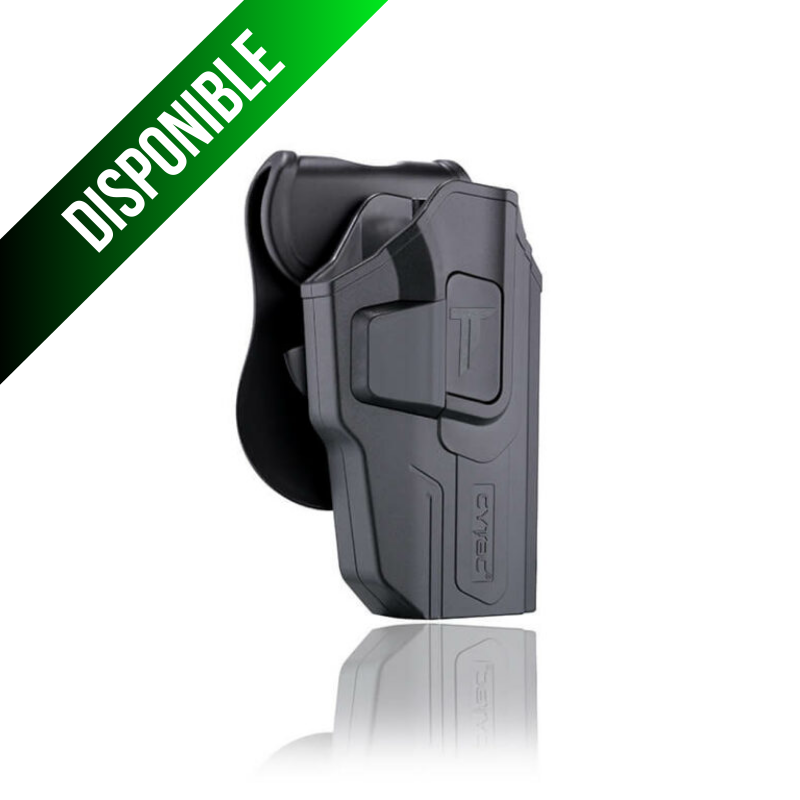 La funda tiene un botón de liberación/bloqueo rápido que permite un desenfunde rápido y un bloqueo automático cuando se vuelve a enfundar el arma