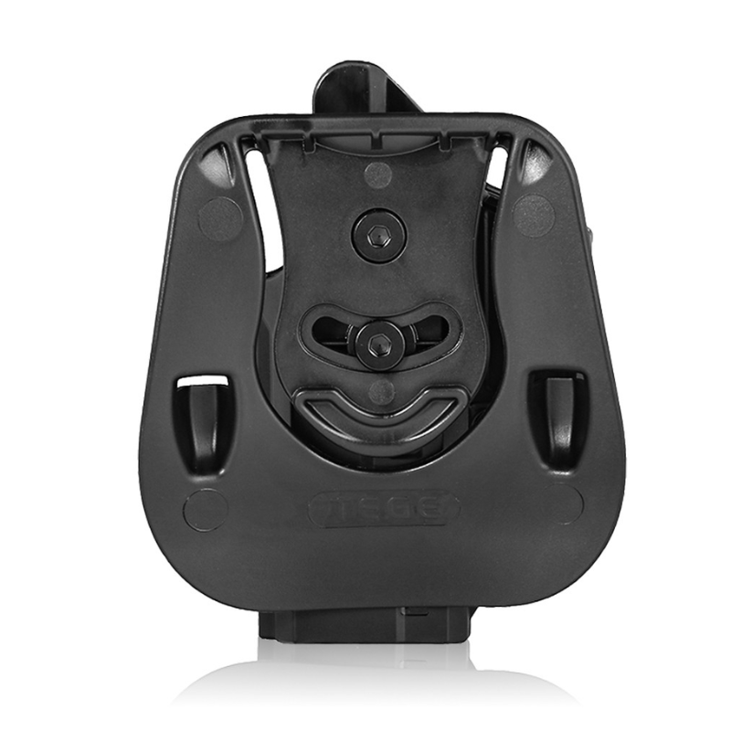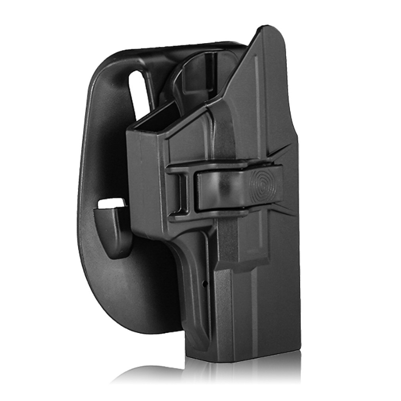 Sistema de bloqueo mejorado que asegura automáticamente el arma al enfundarse. Botón de liberación rápida de fácil acceso y activación. Ángulo fácil de ajustar para desenfundar en ángulo. Incluye paleta y plataforma de cinturón de liberación rápida. Construcción de polímero de alta tecnología y durabilidad, ideal para uso militar y policial. Nota: Compatible con todas las generaciones de Glock. Los modelos Gen 1-4 requieren la instalación de un pequeño espaciador, incluido en la funda. Esta funda es solo para diestros.
