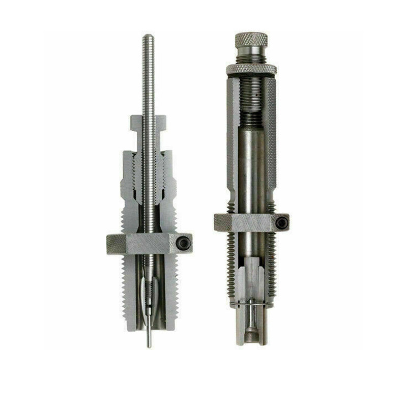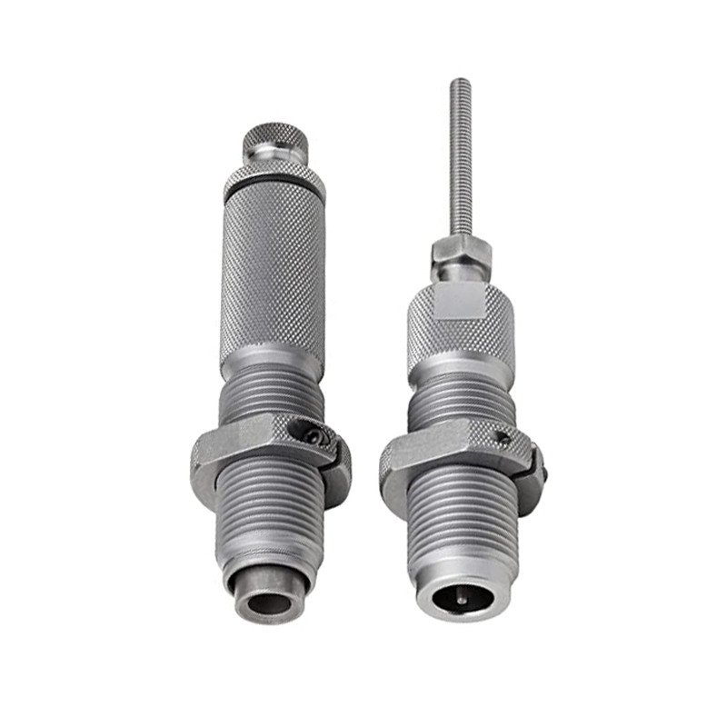 El tornillo se ajusta fácilmente a las profundidades del asiento de bala. Anillos de bloqueo con llave plana alrededor de todo el dado aplicando presión constante. El anillo retenedor se retira en segundos para un fácil desmontaje y limpieza del dado. El sistema de asiento de bala en línea sostiene la bala, el cuello de la carcasa y el tallo del asiento en perfecta alineación en la manga antes de que la bala entre en el cuello de la funda.