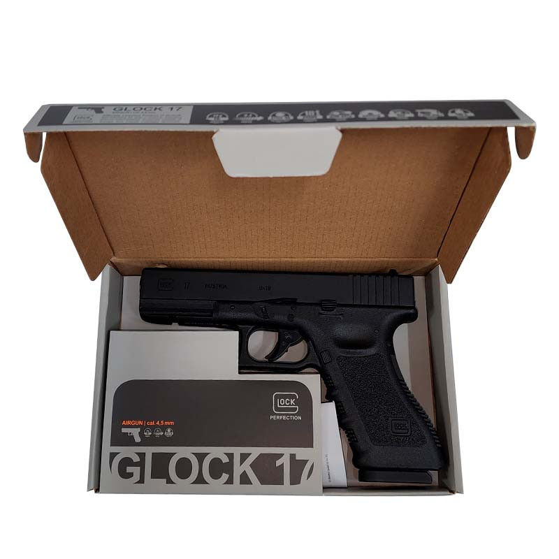 La versión original de la famosa GLOCK 17 ocupa un lugar importante en muchas colecciones de armas. Para aquellos que quieren compartir la emoción de tener una GLOCK, la versión CO₂ de venta libre es la solución perfecta. Esta réplica es totalmente fiel al aspecto de la pistola original, con todas sus marcas. Pero no fue hecho para ser guardado en una vitrina. Con su corredera de metal pesado, potente retroceso y cargador todo en uno, la GLOCK 17 promete horas de diversión disparando balines de acero de 4,5 mm.